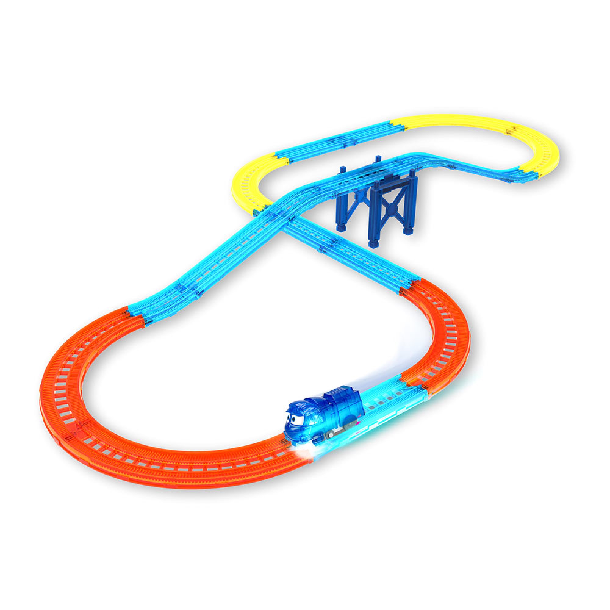 У комплекті представлені: 18 рейок для прокладання залізниці; прозорий локомотив Кей з двома рівнями швидкості та вбудованими світлодіодами, що висвітлюють шлях; підставка.