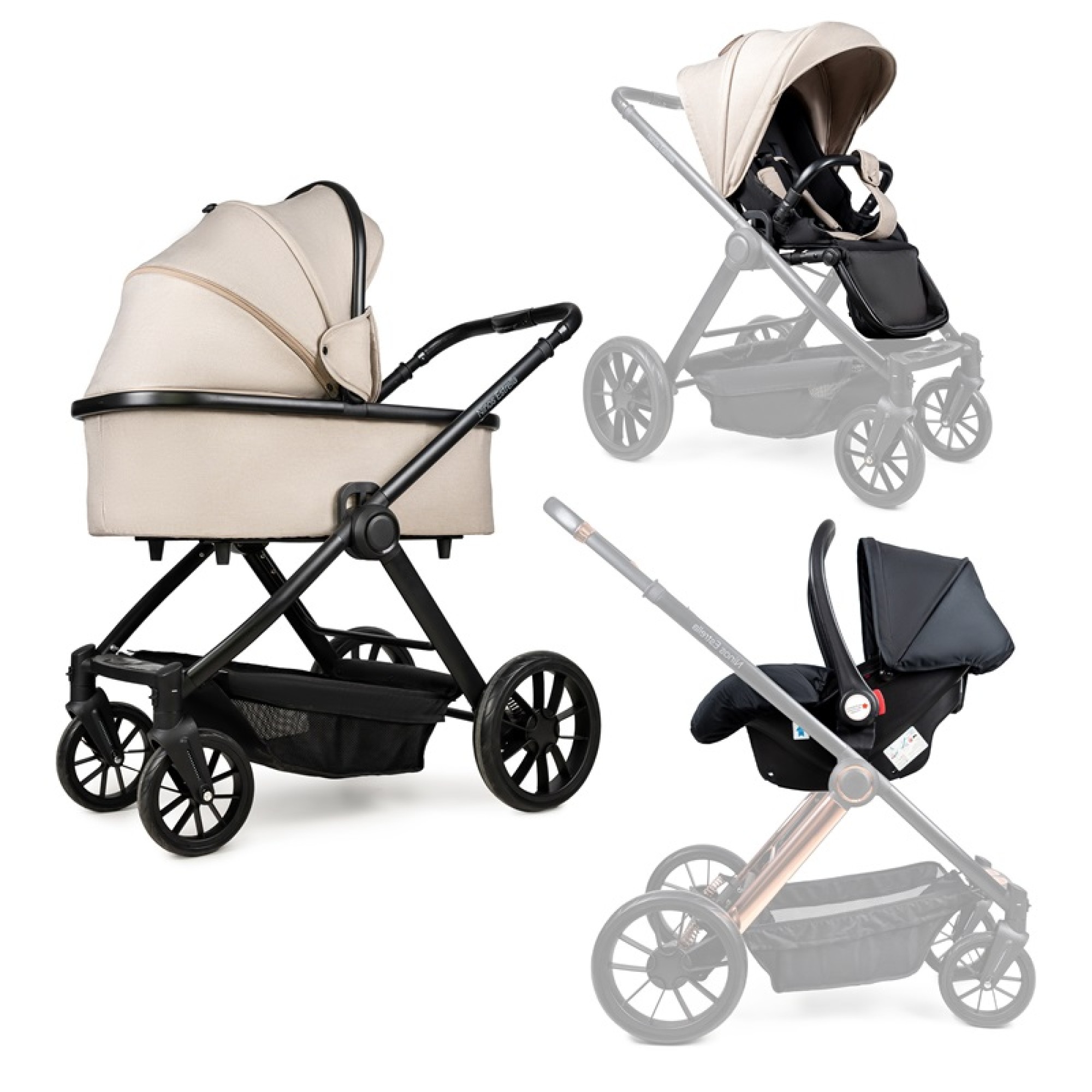 всесезонна дитяча коляска 3 в 1 з реверсивним прогулянковим блоком та автолюлькою • Beige Black