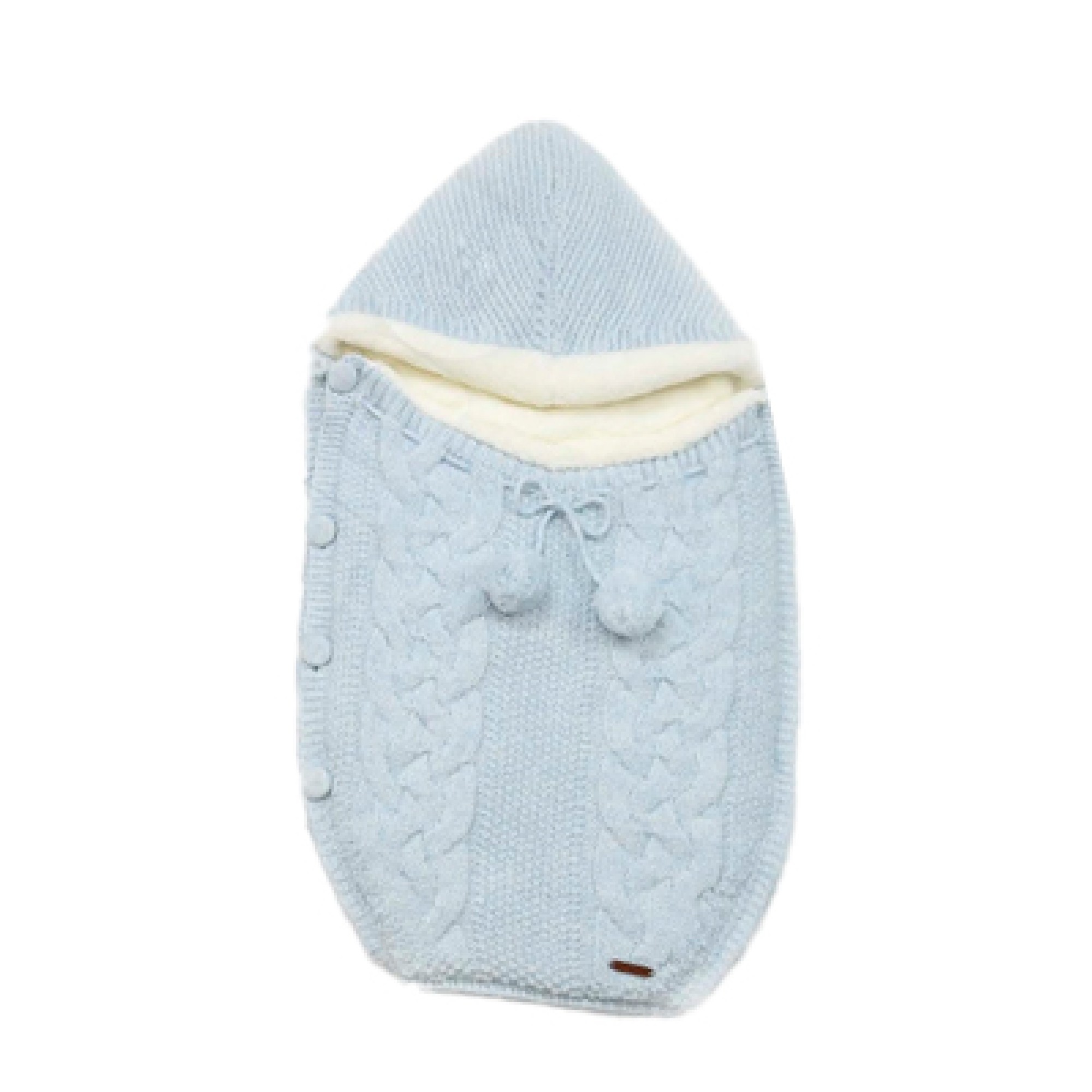 Конверт Nipper Land у блакитному кольорі виготовлений з м'якої в'язаної тканини, яка забезпечує тепло та комфорт для вашого малюка під час прогулянок. Він оснащений капюшоном і декоративними помпонами, що додають йому особливого шарму. Конверт ідеально підходить для дітей віком від 0 до 6 місяців.