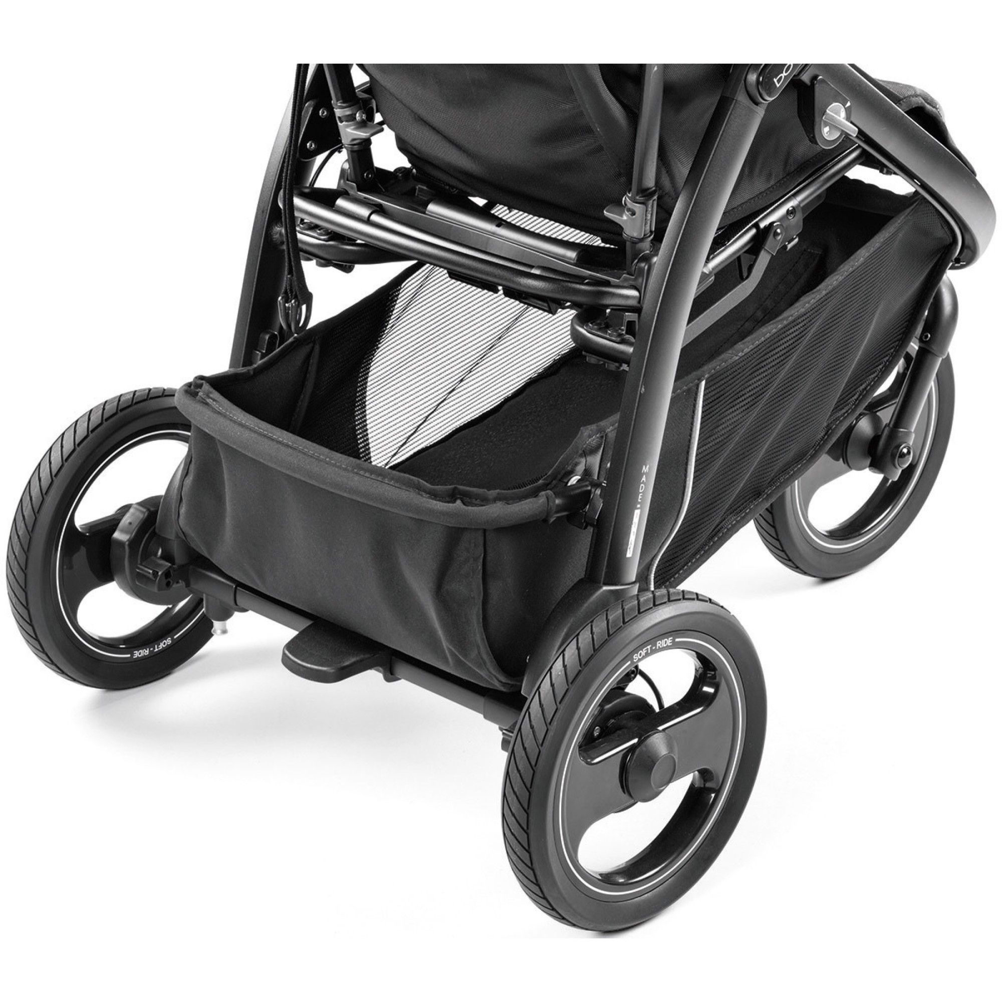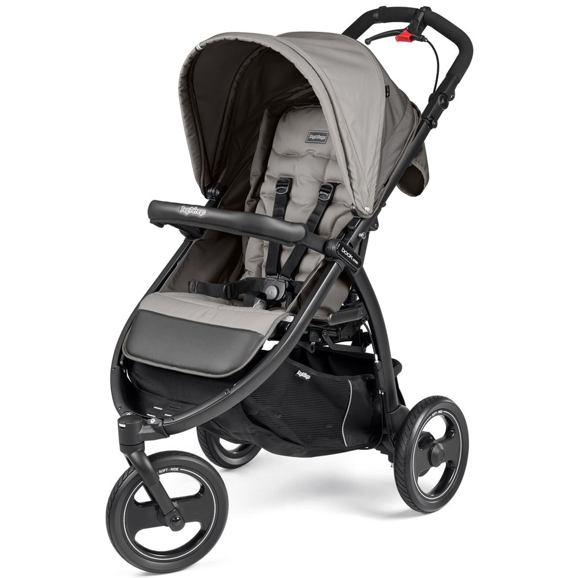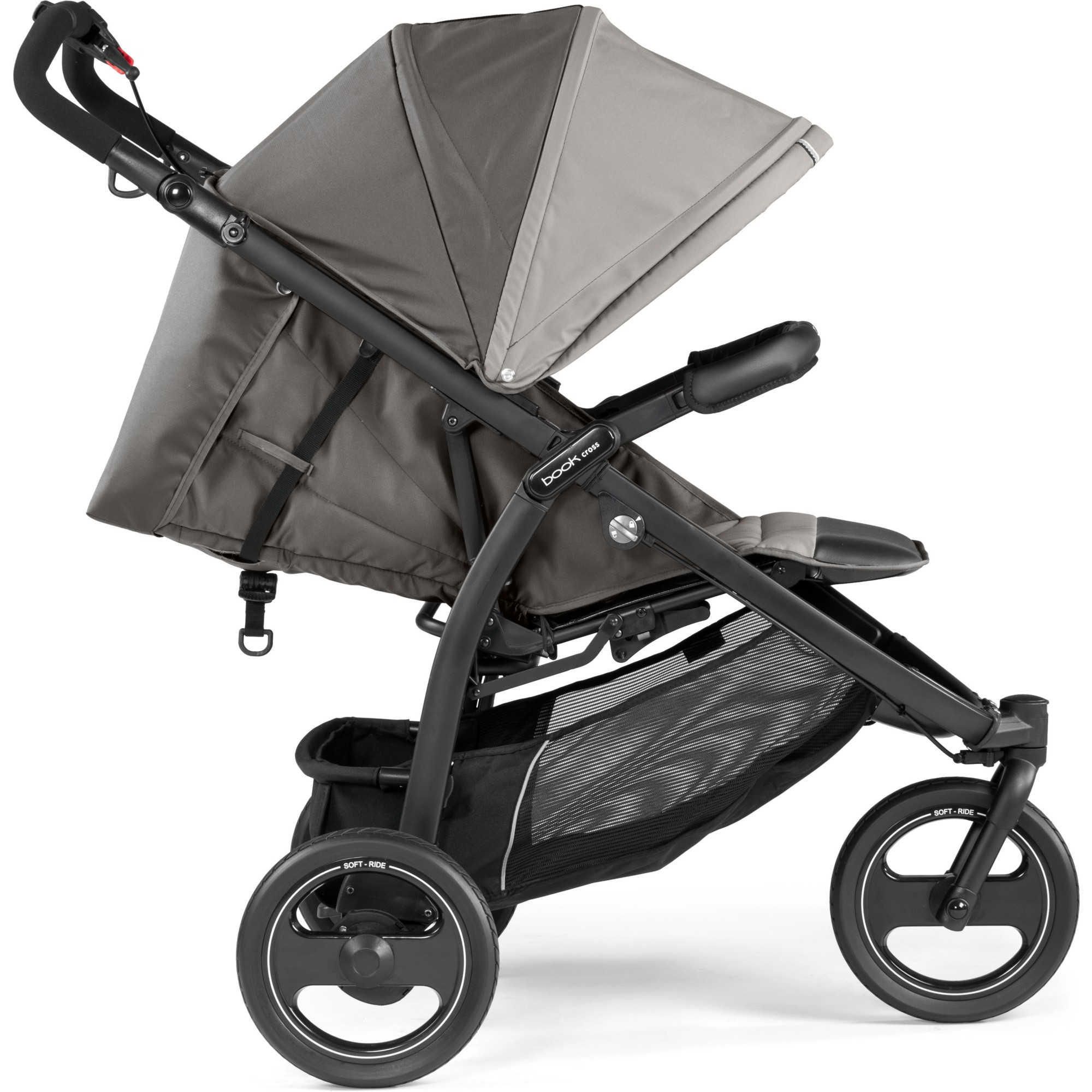- Три великих колеса діаметром 26,8 см виготовлені за технологією Soft-Ride, що забезпечує міцність. Колеса оснащені системою Easy Drive від Peg Perego (8 шарикопідшипників) і пружинними амортизаторами, що роблять коляску Book Cross легкою в управлінні, легкою в управлінні і дозволяє гуляти де завгодно, наприклад, по піску, траві і грунтових дорогах;