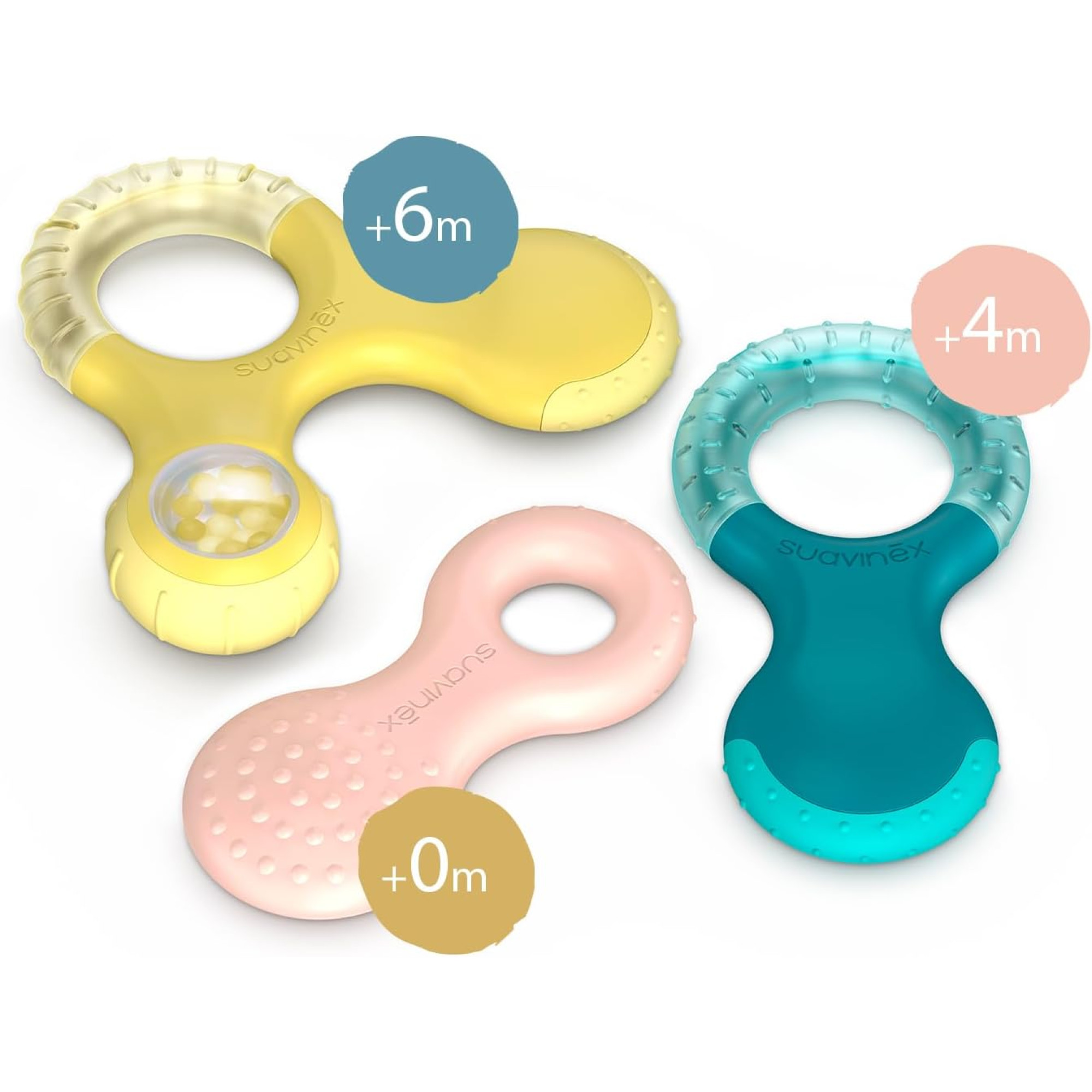 Прорізувач Suavinex (Суавінекс) з брязкальцем допоможе малюкові впоратися з хворобливими відчуттями та свербінням ясен під час прорізування зубів на кожному з етапів.