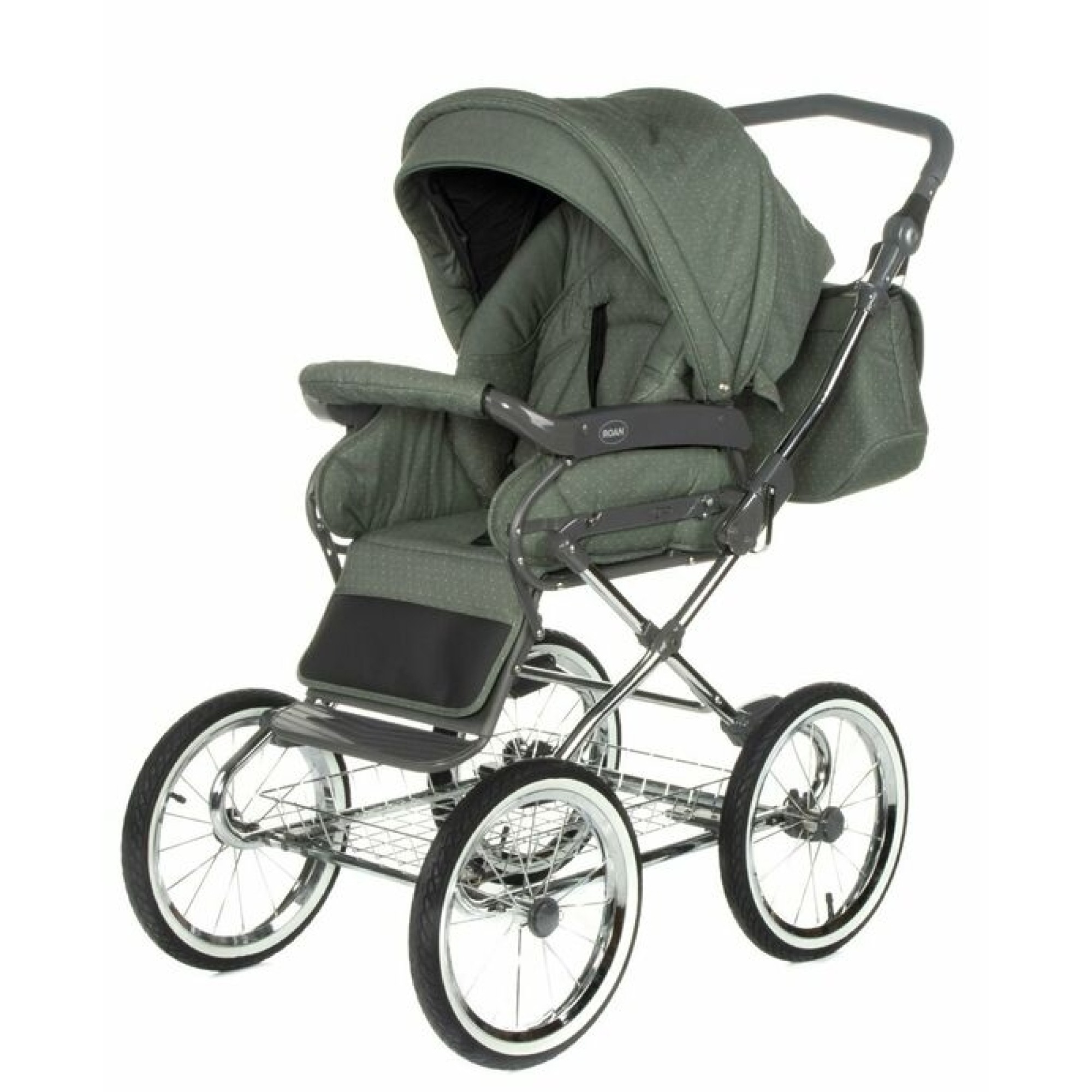 Roan Emma E-79 (Роан Емма) - зберегла у своїй конструкції чисто класичні елементи, наприклад, хромовану раму з металевою корзиною. Надійна рама цієї коляски дозволяє без праці заколисувати малюка завдяки шарнірним з'єднанням, при цьому гойдати її можна як у поперечної, так і в поздовжній площині.