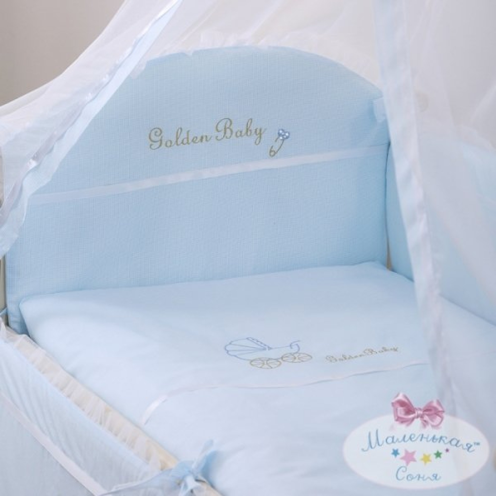 На ошатному підодіяльнику красується золотий напис, прикрашена каменями Сваровскі і атласними стрічками, «Baby Golden» ( «Золота Дитина») і прекрасна вишивка дитячої коляски.