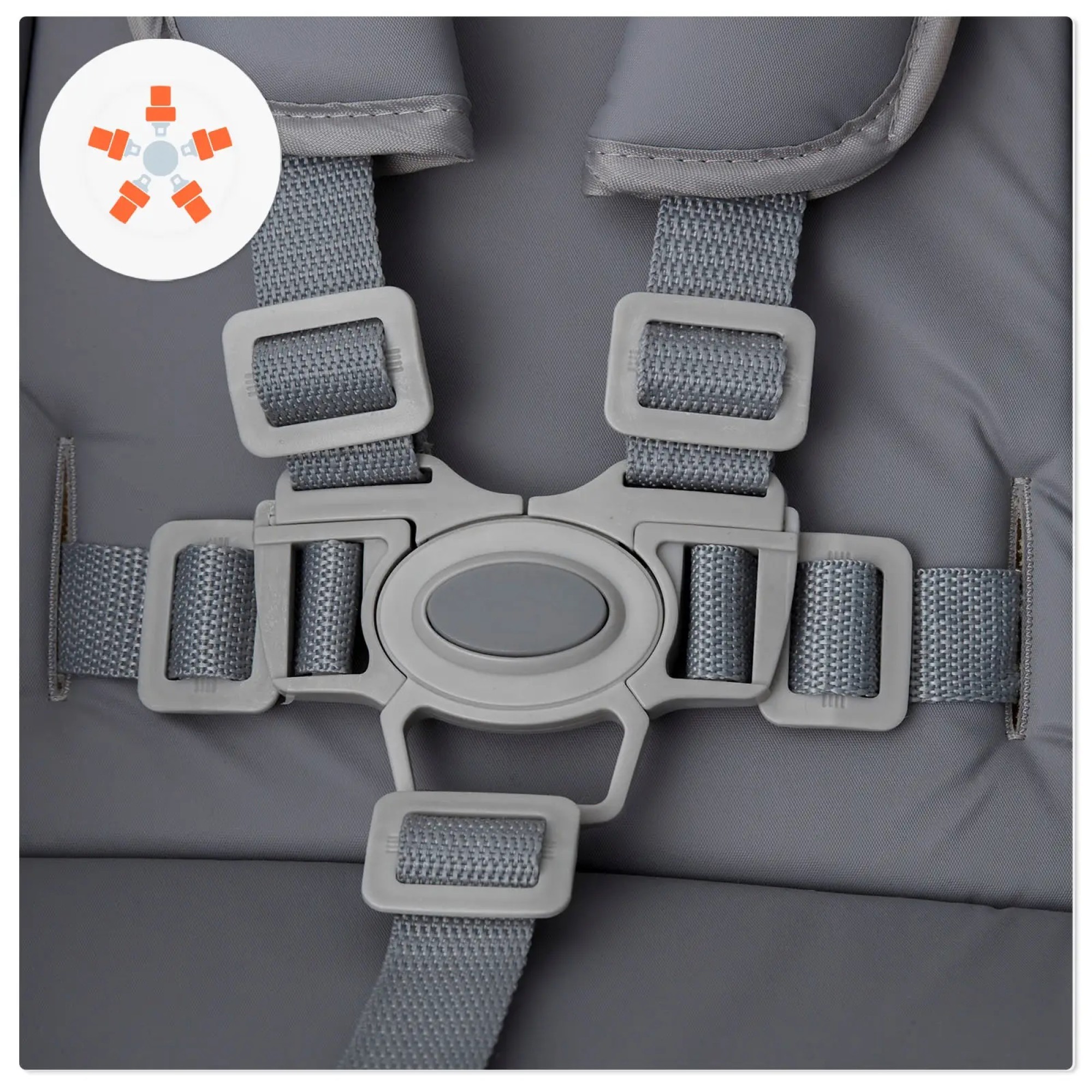Крісло вироблено з дотриманням найвищих стандартів якості та схвалено згідно з європейським стандартом безпеки EN 14988 . Тим не менш, для забезпечення безпеки кожного прийому їжі, рекомендується використовувати 5-точковий ремінь безпеки , який фіксує вашу дитину. Для запобігання випаданню з сидіння також є блокувальник між ніг.