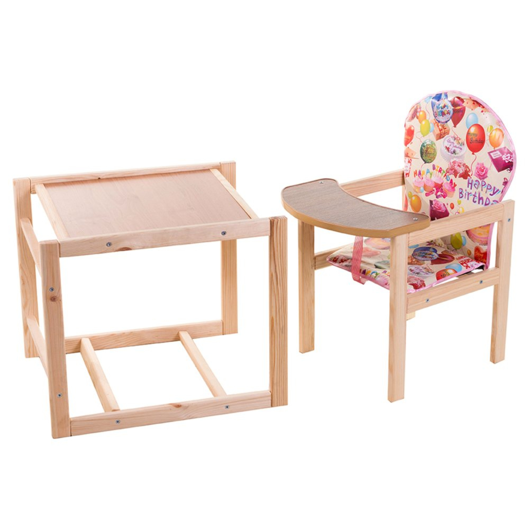 Дерев'яний стільчик для годування Наталка може трансформуватися власне з високого стільчика для годування з індивідуальної стільницею в стіл парту для годування, ігор та занять. До використання стілець трансформер Наталка рекомендований для дітей з 6 місяців до 6 років. Стільчик виготовлений з натурального шліфованого дерева без покриття. Стільниця парти і стільчика - ламіноване ДСП. За чохлом стільчика для годування Наталка легко доглядати. Щільна, непромокаючий оббивка легко протирається вологою губкою. Сидіння і спинка стільчика - м'які. Між ніжками у дитини передбачений ремінець обмежувач. При використанні стільця трансформера Наталка в якості окремого столика і стільчика маленька стільниця і обмежувач можуть зніматися.