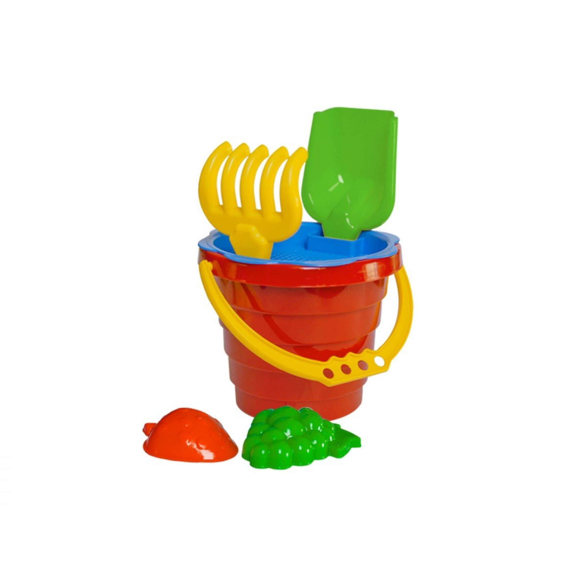 Набор для игры в песке и саду. Яркое ребристое ведёрко с удобной ручкой, лопатка, грабельки, 2 формочки и сито. В сите - 2 дополнительных отверстия для удобного ношения грабелек и лопатки.