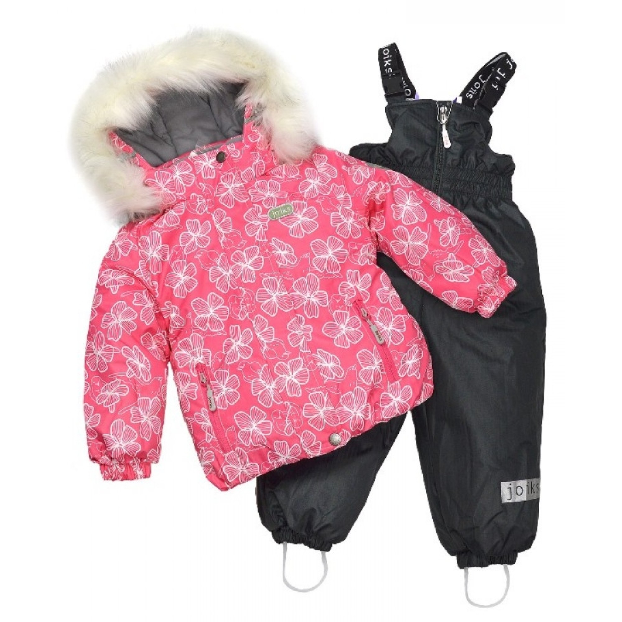 Яскравий і оригінальний зимовий костюм для дівчинки від Joiks прекрасно доповнить гардероб маленької принцеси. Комплект складається з курточки рожевого кольору з принтом і напівкомбінезона на двох бретелях.
