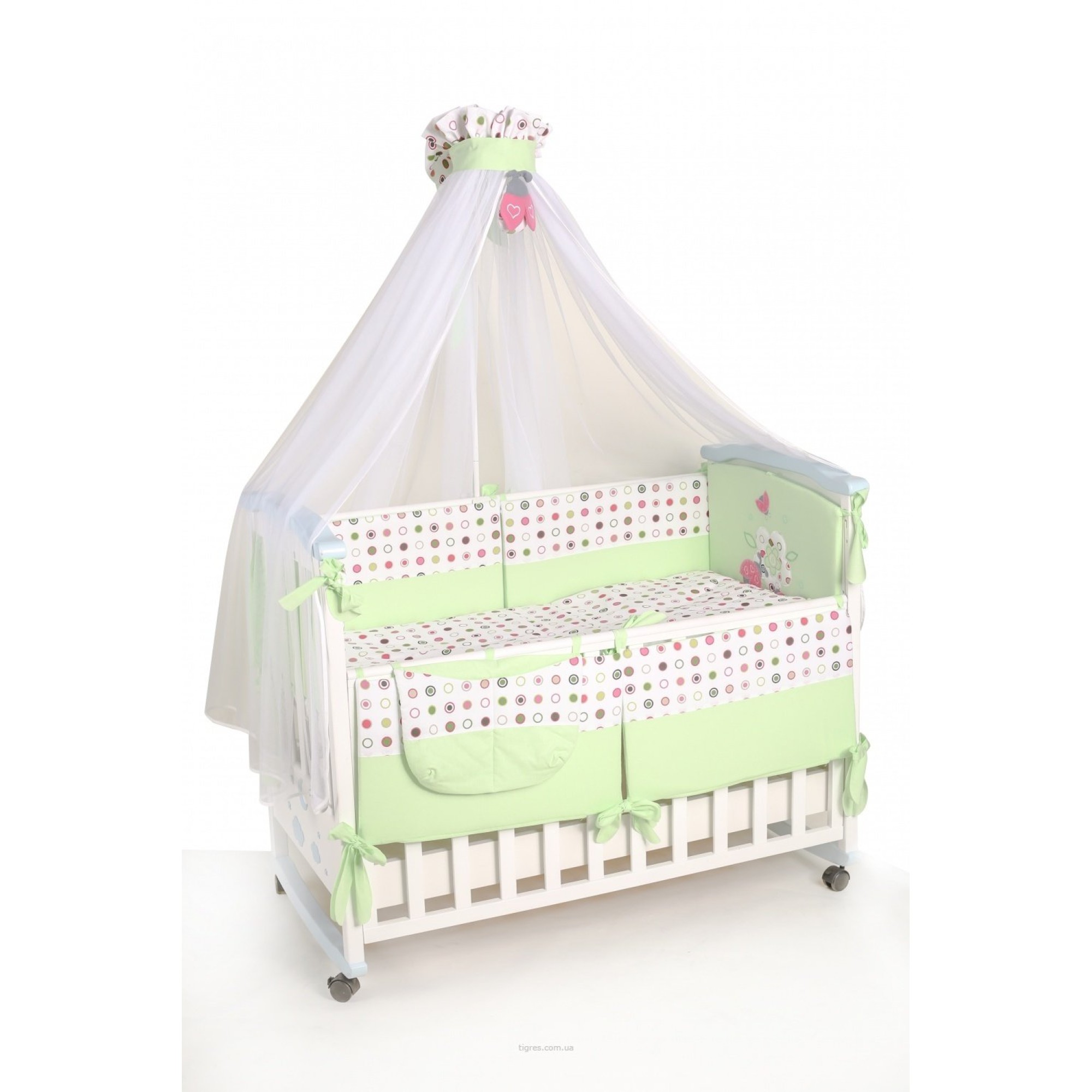 Резинка дозволяє легко фіксувати положення простирадла на матраці. Карман дозволить зберігати дрібні речі, які можуть вам знадобитися біля ліжечка малюка. Зручні бортики по всьому периметру ліжечка додатково оберігає дитину. Балдахін захищає малюка від комах і створює додатковий затишок в його теплій ліжечку.