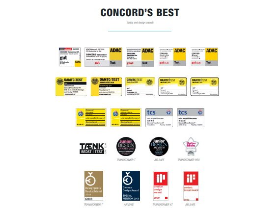 Рівень якості, безпеки, дизайну автокрісел для дітей Concord підтверджують нагороди міжнародних журналів і сертифікати автомобільних клубів ADAC, AutoBild, AutoZeitung, Mother & Baby, OAMTC.