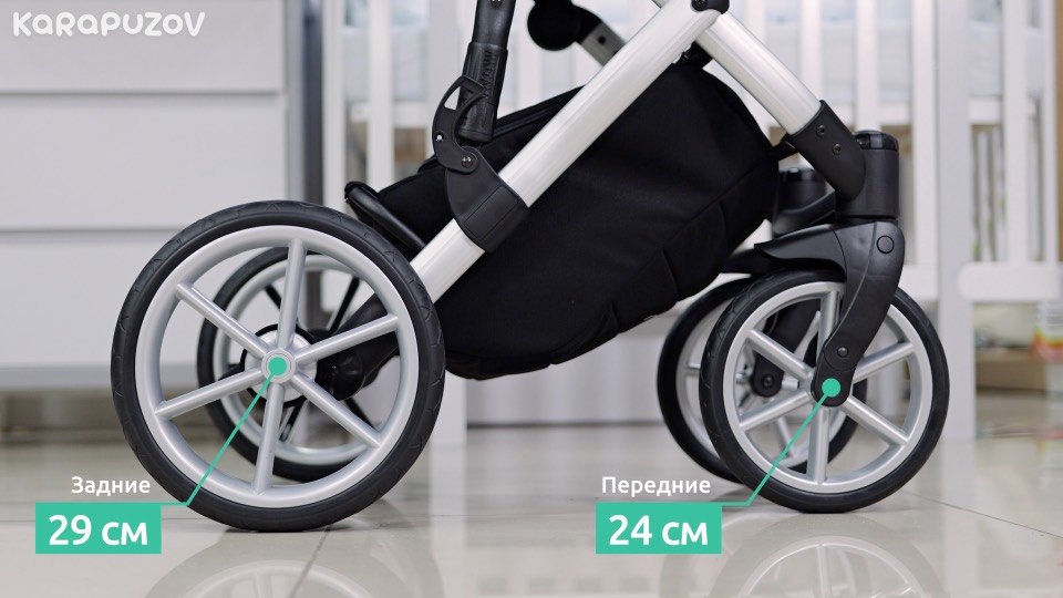 Колеса Junama Space ідеальні для наших реалій. Всередині колеса складаються з гелю, тобто вони непробивні, а зовні - гумові покришки. Таким чином знижується ймовірність того, що по снігу колеса коляски будуть прослизати.