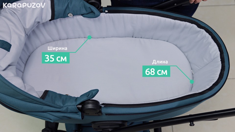 Розміри спального місця люльки Junama Space 68 на 35 см. У довжину люлька не найбільша, але ось "в плечах" дуже широка. Це важливий момент для комфортного перебування дитини в зимовому комбінезоні або утепленому конверті.