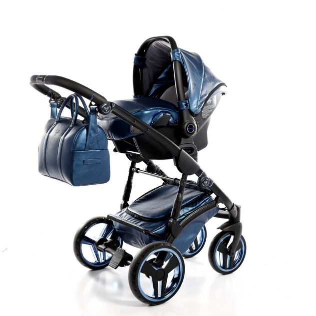 Дитяча коляска для новонародженого синього кольору з екокожі з металізованим ефектом. Обід колеса і декоративні вставки сріблясто-сірого кольору.