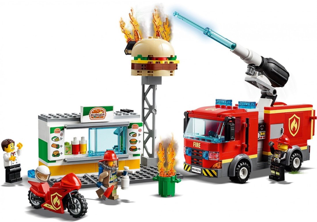 Всі сподіваються тільки на тебе і пожежну машину з світяться мигалками! Горить місцевий бургер-бар, скоріше туші пожежа! У наборі є різні пристосування для гасіння пожежі, мотоцикл і помічники.