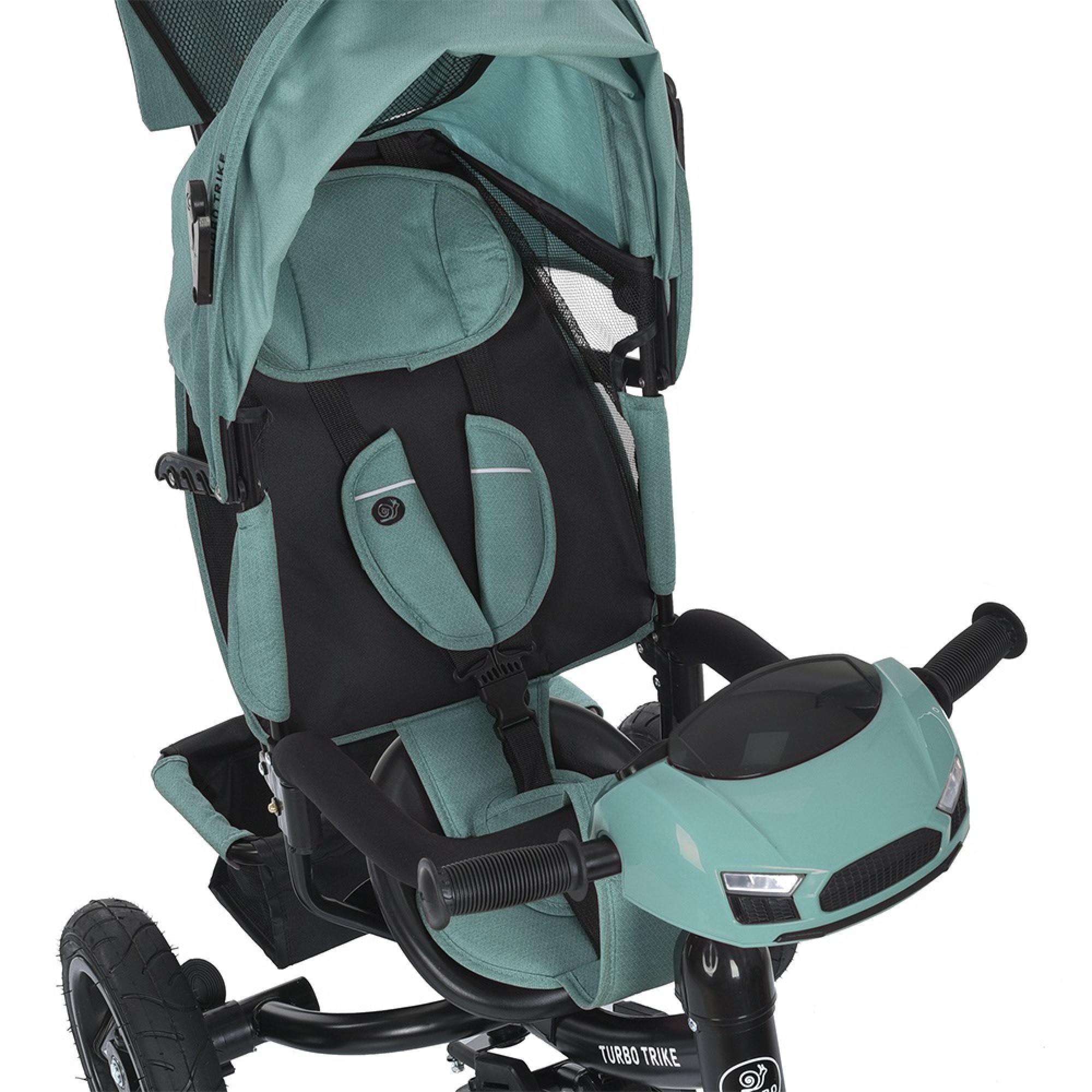 3-х точкові ремені безпеки з м'якими накладками зі світловідбивними смугами, розсувний бампер з м'якою накладкою, ремінь-захист від сповзання.