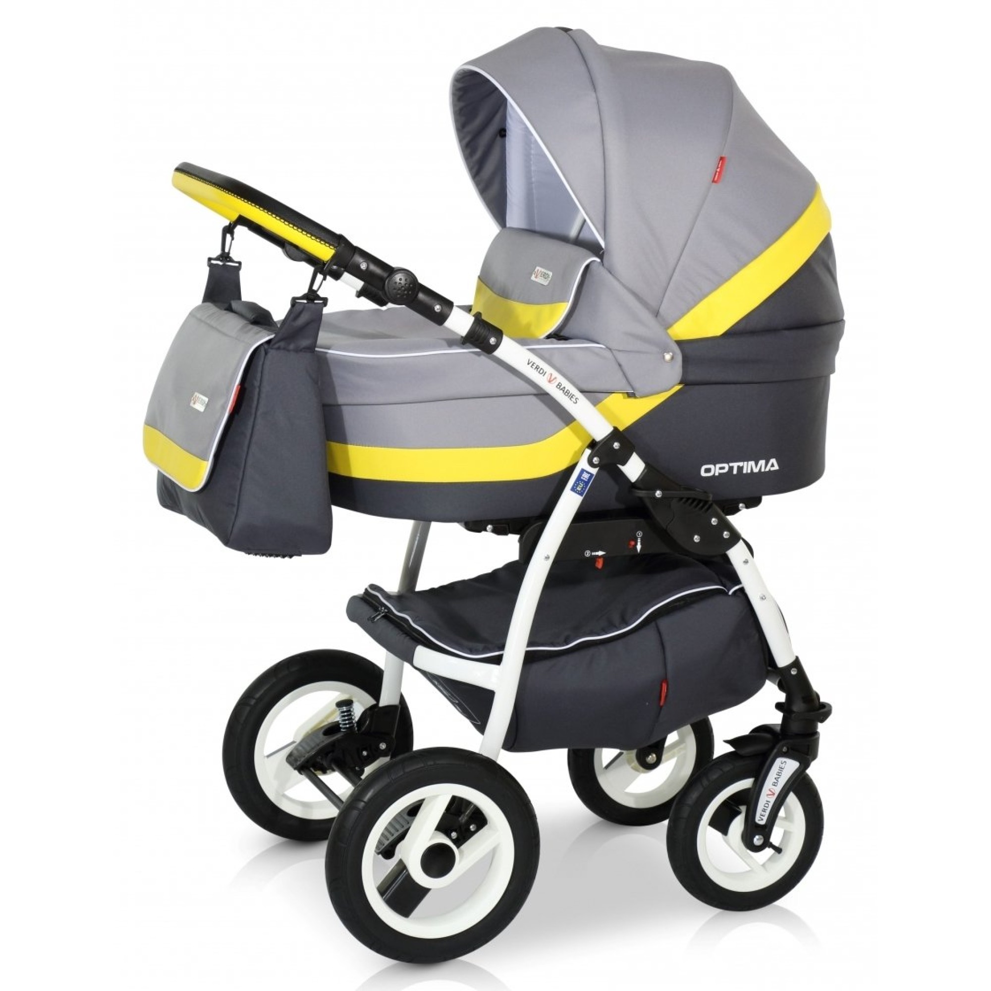 Verdi Optima сіро-жовтого кольору - максимально практична та легка у використанні. Коляска 2 в 1 із просторою люлькою створює відчуття комфорту та захищеності малюку, а сучасна рама забезпечує маневреність в управлінні для мами.
