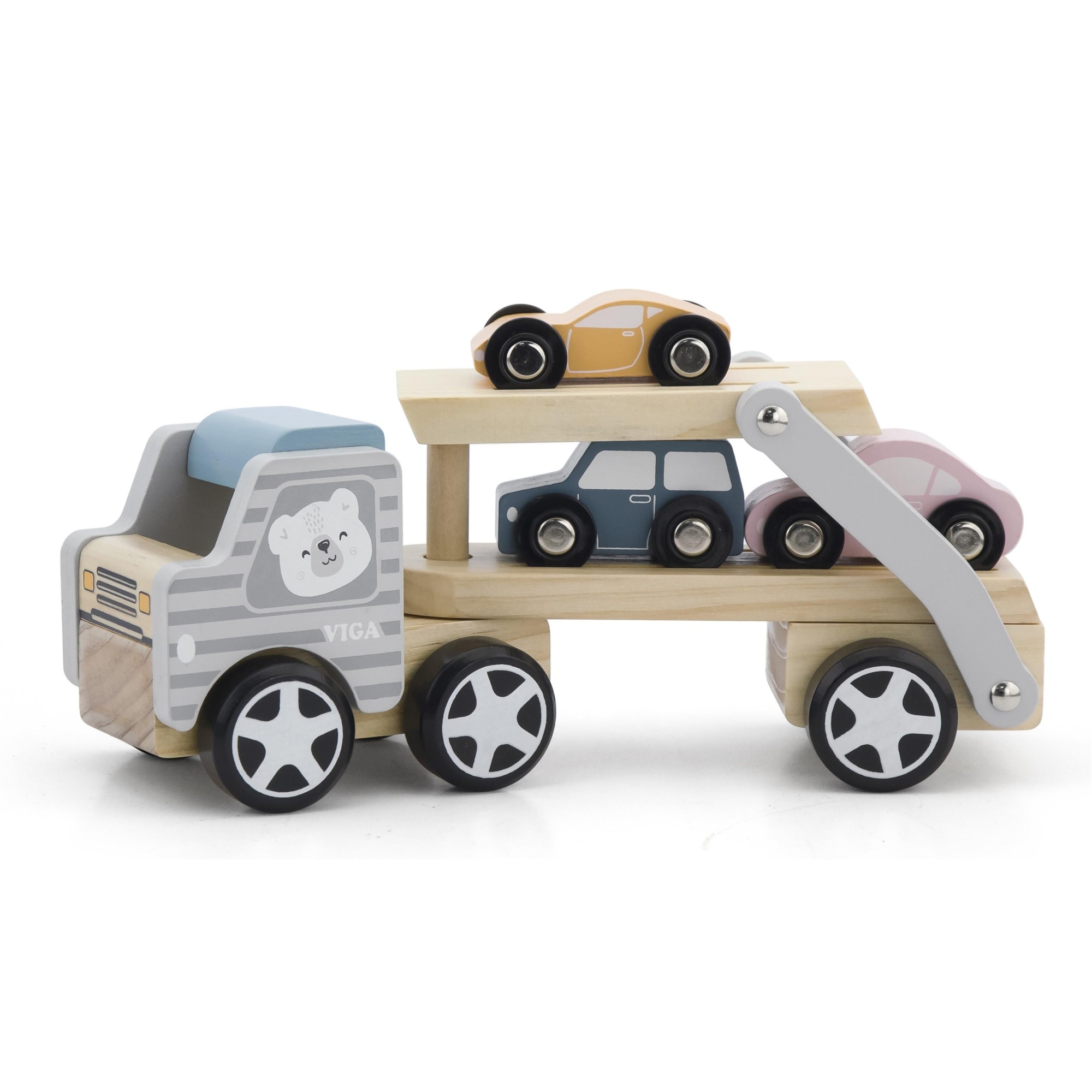 Іграшка у вигляді автомобілевозу складається з тягача та дворівневої платформи для перевезення трьох моделей легкових машин. Верхній рівень опускається для завантаження та вивантаження авто. Ігровий комплект із дерева, пофарбований у спокійні кольори з оригінальними малюнками.
